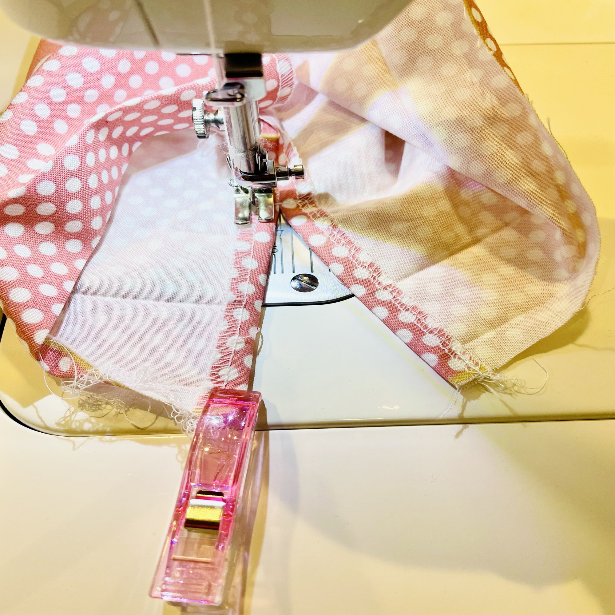縫い合わせた境目の部分(あき止まり)はミシンを一度止めて、針を刺したまま押さえを上げて布の向きを変えて縫うときれいに仕上がります。