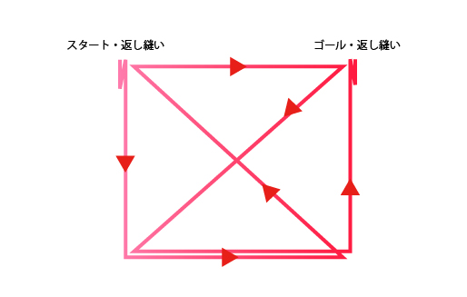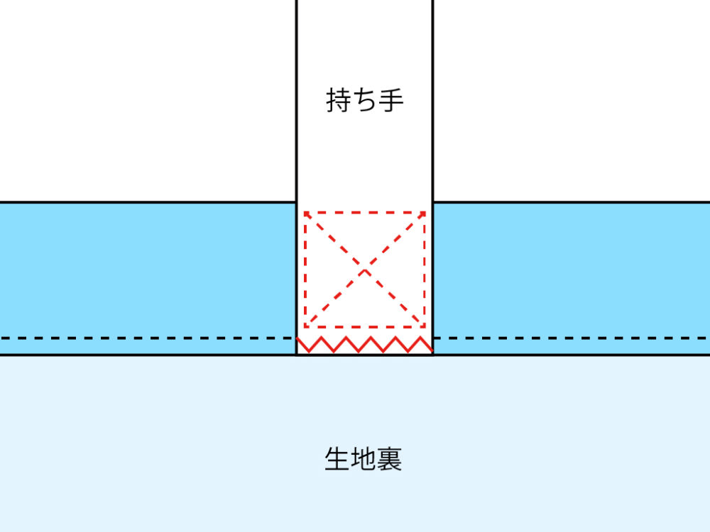 • 図の赤点線のように、縫い付けると丈夫に仕上がります。