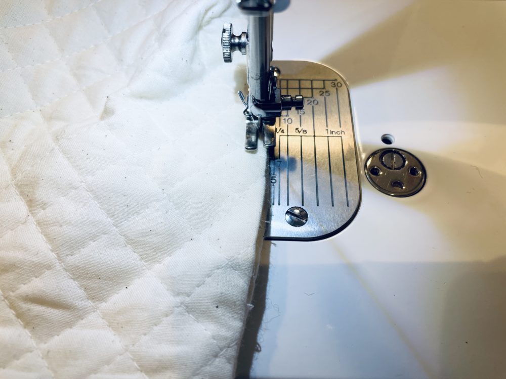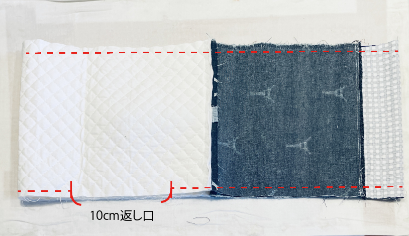 周囲(両脇)を縫いますが、裏地の片側だけ「返し口(10cmほど)」を縫わずに開けておきます。