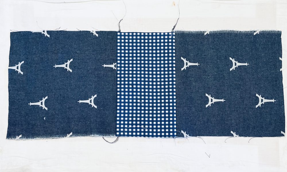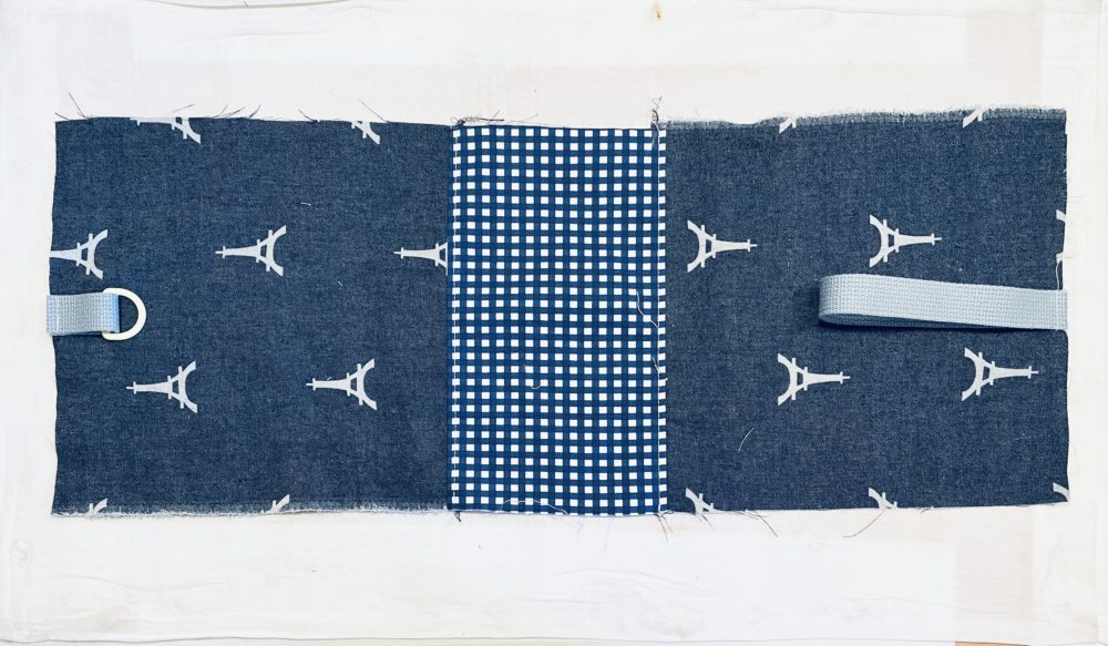 アイロンとステッチ 縫い代を「底側(濃い色の布側)」に倒してアイロンをかけます。 表側から、縫い目のキワ(底布側)に直線縫い(ステッチ)をかけると、丈夫になり見た目も引き締まります。 これで「1枚の長い布」の状態になりました!