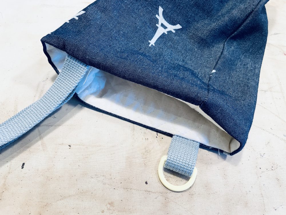 入れ口に半分に畳んだ持ち手を縫い付けます。短い方にはDカンを挟んでください。